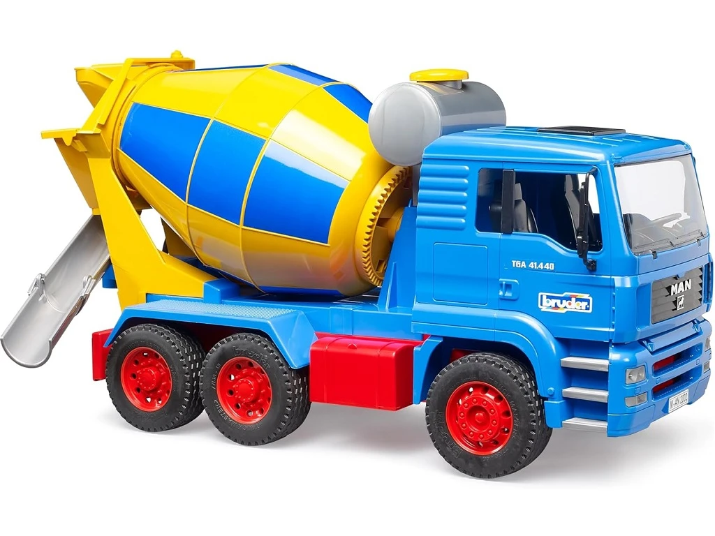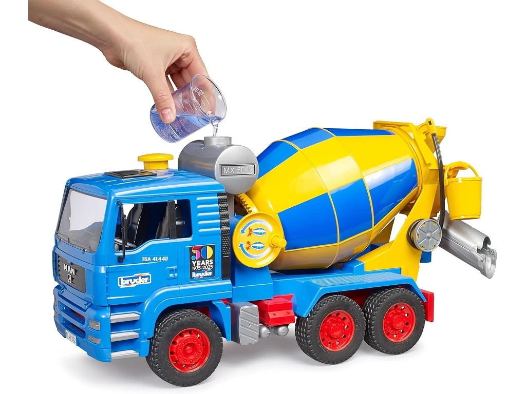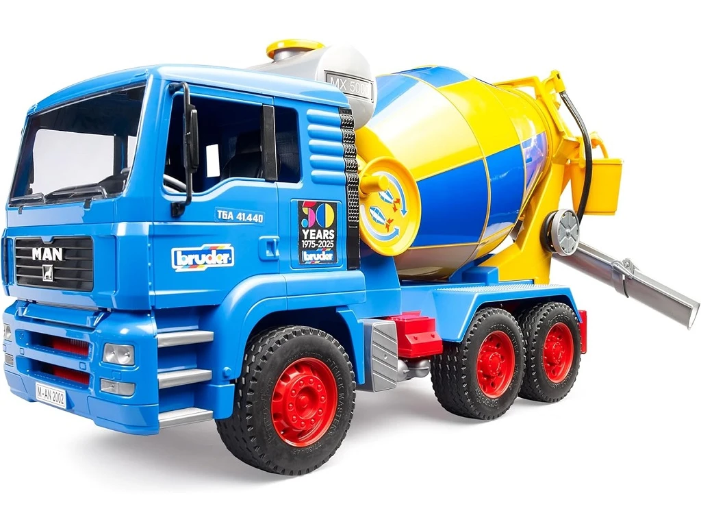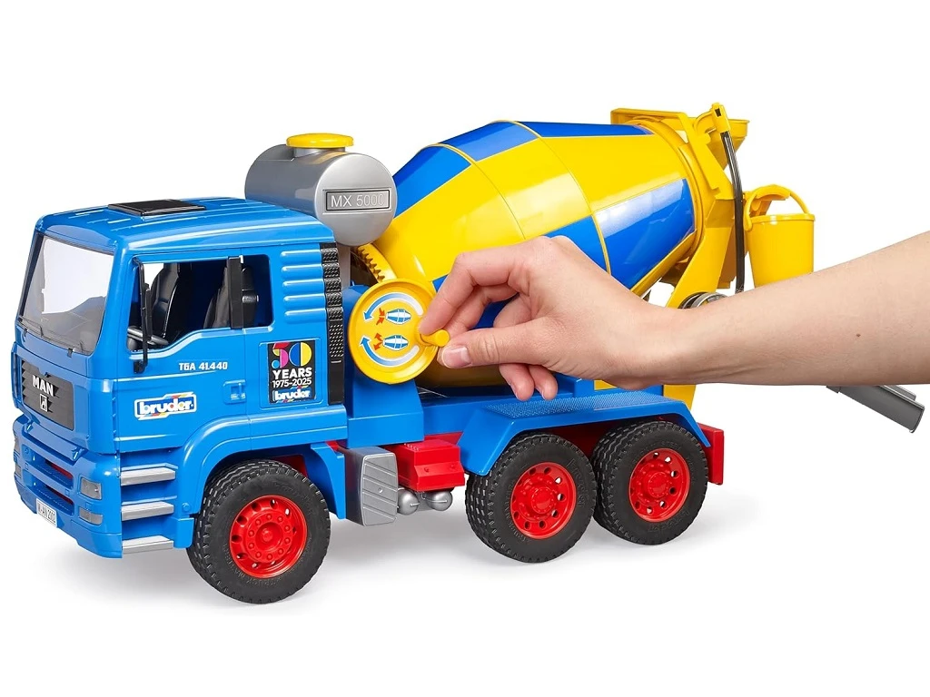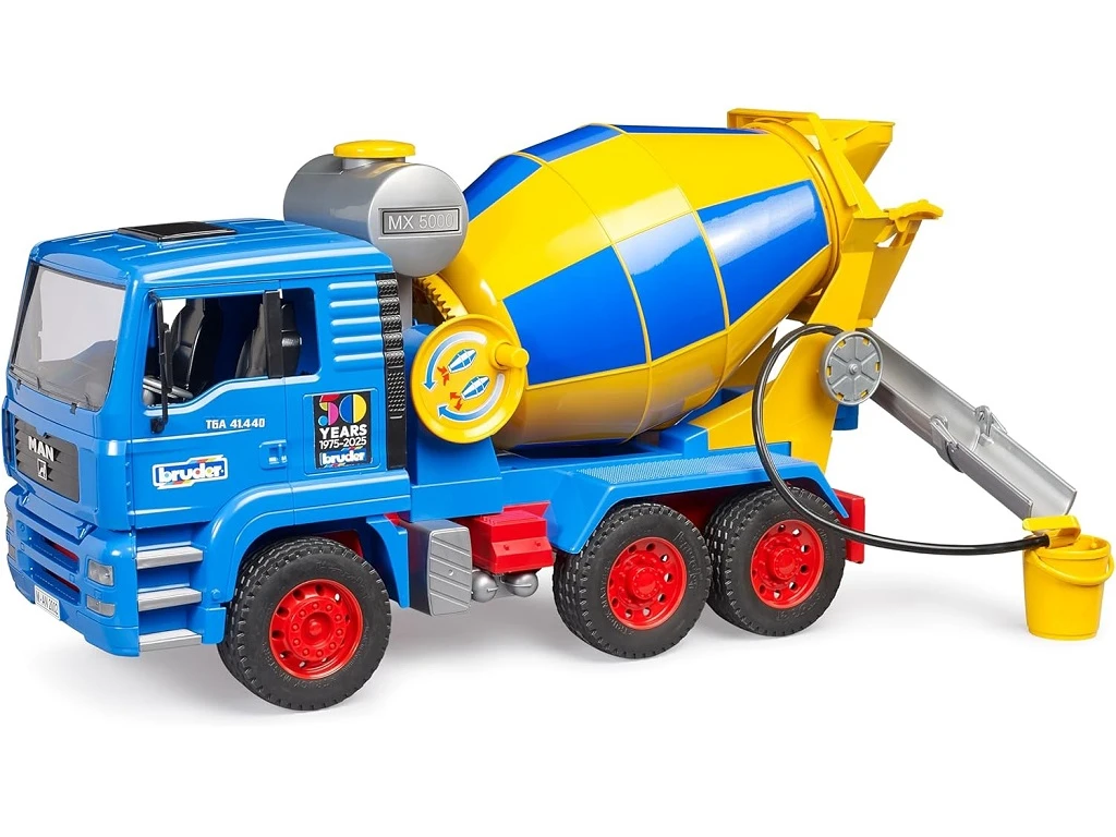 Bring the excitement of a real construction site to life with the Bruder MAN TGA Cement Mixer Truck. Designed in celebration of Bruder’s 50th anniversary, this vibrant and functional model stands out with its unique yellow drum, blue cab, and red wheels. Crafted to 1:16 scale, this mixer truck delivers exceptional detail and play value for young builders.