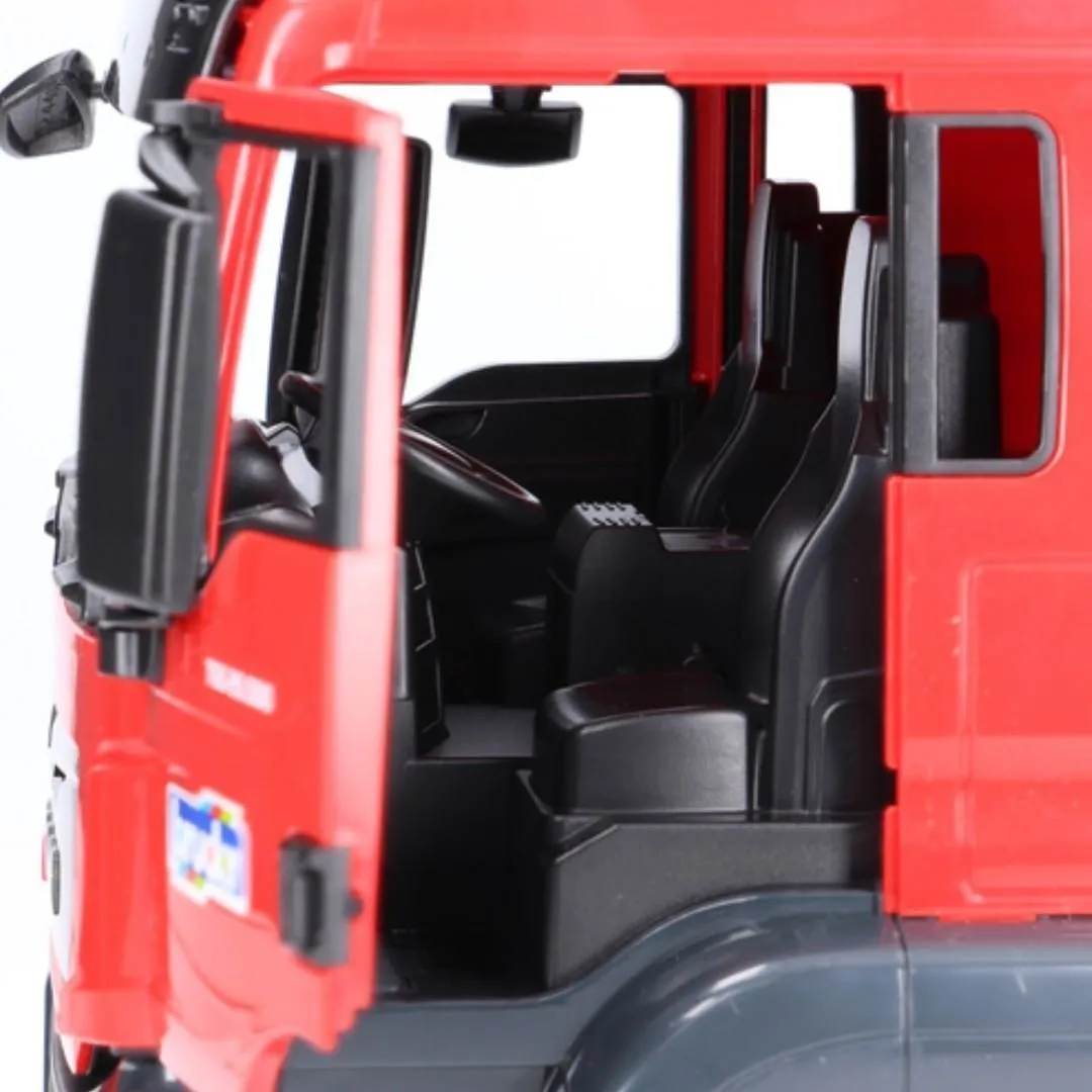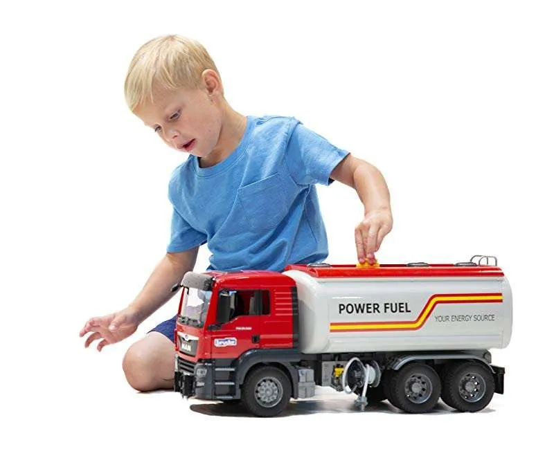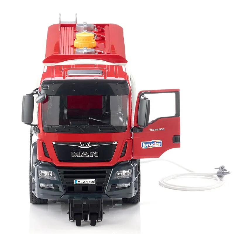 Bruder Man TGS tank truck 03775 - The MAN TGS is an excellent all-rounder for construction sites, long-distance transport and local distribution. With its durable design, powerful engines and above-average payload, this truck is a versatile utility vehicle with plenty of innovation on board. Bruder's 1:16 scale model of the MAN TGS tank truck is a combination of a new MAN cab and a renewed tank superstructure. This fully functional tank upgrade also brings many new features for our young tank drivers. Fill the tank with water. Create pressure with a manually operated compressed air pump and release the water through the pipe using the shut-off lever with the discharge unit. You can place the Bworld figures in the cab or climb the ladder onto the vehicle and inspect the tank from the top.