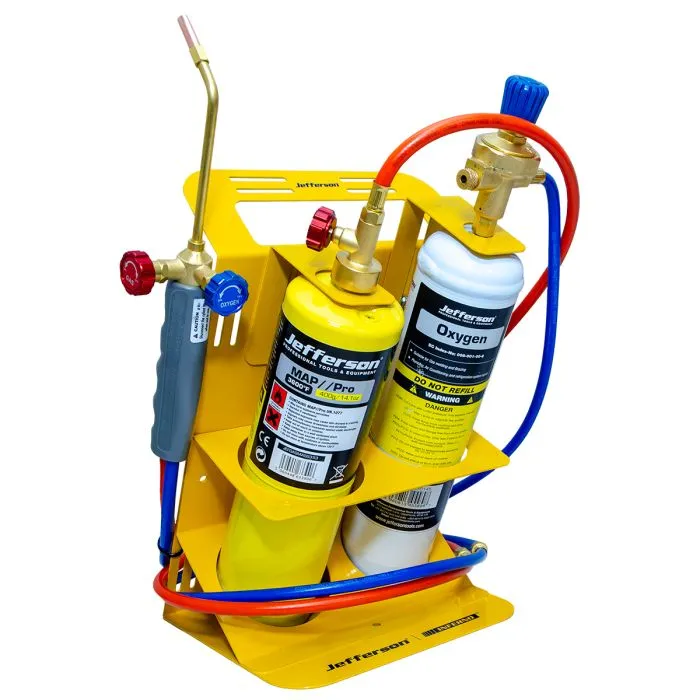 The Jefferson MAPP & Oxygen Brazing Kit JEFGASBRAZKIT is engineered for those who need high performance and versatility in their metalworking tools. This brazing kit features a MAPP gas and oxygen torch that delivers an adjustable flame, making it suitable for a wide range of tasks such as cutting light steel, brazing, soldering, and light welding.