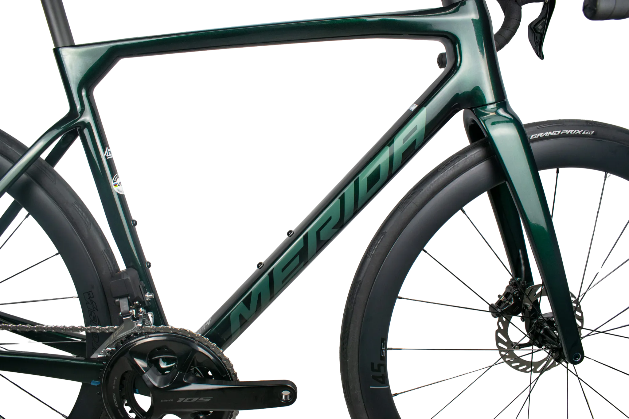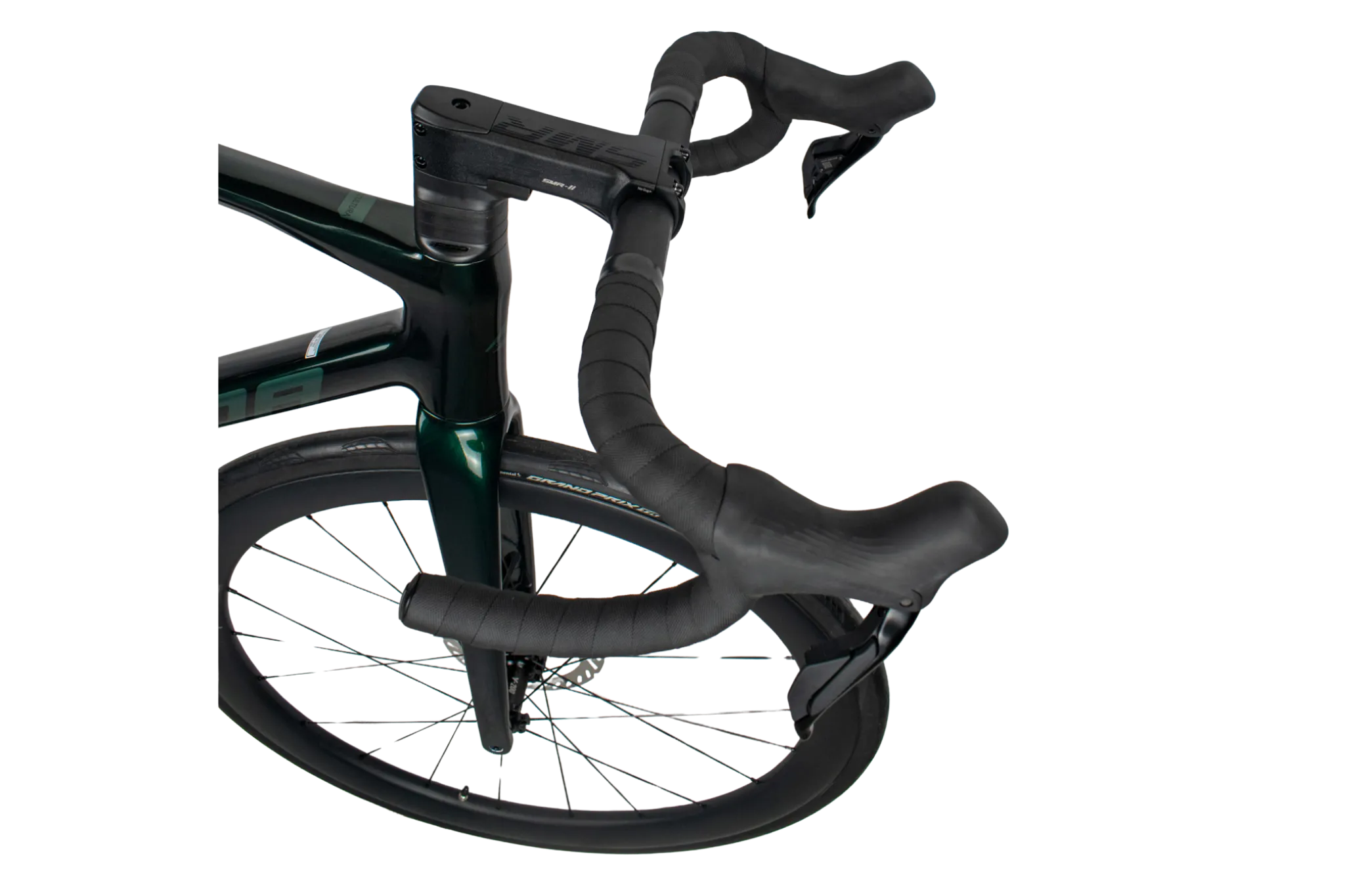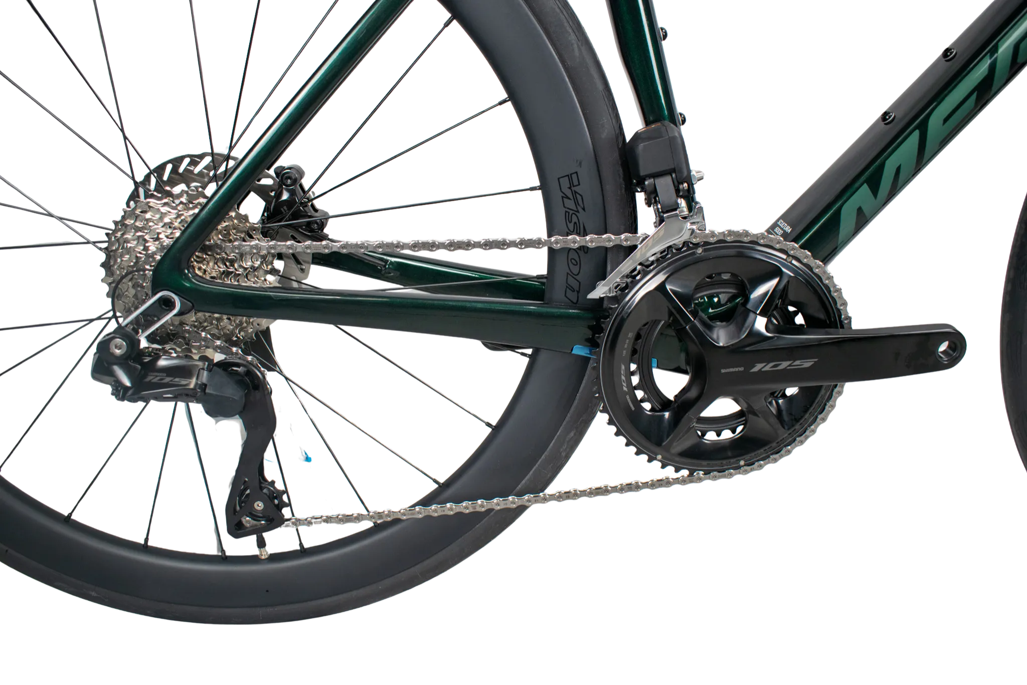 Carbon CF3 framed road bike with a full 24 speed Shimano 105 groupset with Di2 electronic shifting, Vision SC45 carbon wheelset, Shimano 105 hydraulic disc brakes and Continental Grand Prix TR 28c tyres
