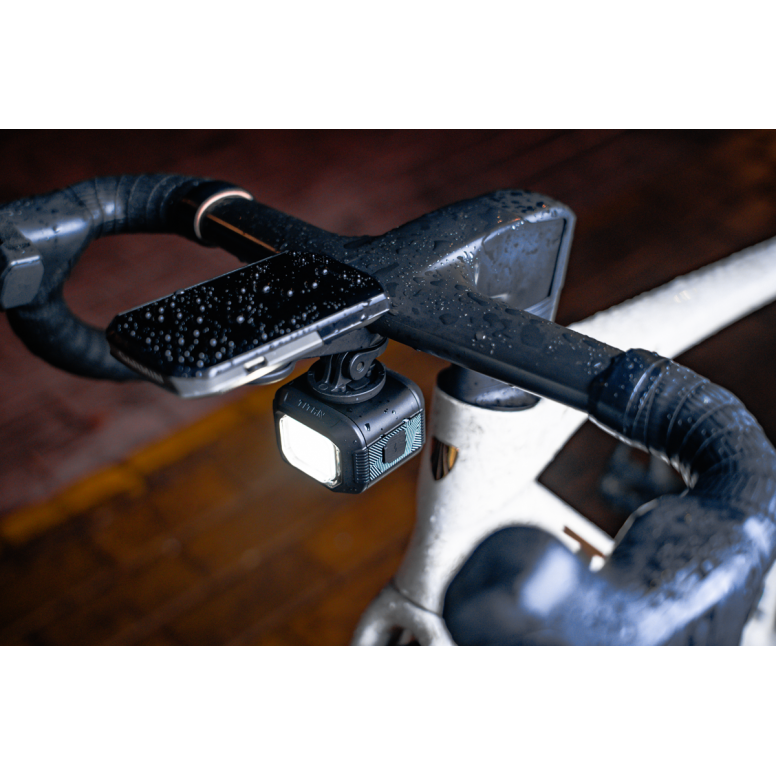 Mounts above or below the handlebars using the included out-front bracket. Also includes a GoPro-style adapter for integrated setups with cameras or computers. Quick release compatible with 31.8–35mm handlebars.
