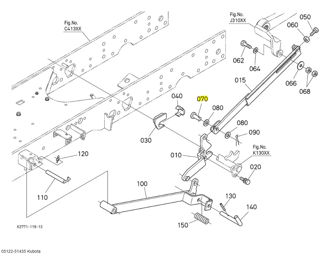 The Kubota Pin Joint 05122-51435 is a high-quality steel pin engineered to provide reliable connectivity in mower rear link assemblies, front linkages, and mower fit kits. Built to Kubota's strict OEM standards, this pin joint is designed to handle high stress and frequent movement, making it an essential replacement for worn or damaged pins in Kubota tractors and mower decks.