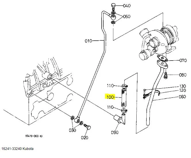 The Kubota 16241-33240 oil pipe is a genuine replacement part engineered to deliver optimal oil flow to the turbocharger in select Kubota engines. Constructed to original specifications, this durable pipe helps ensure proper lubrication and cooling of the turbo unit, extending the life of both the turbo and engine.