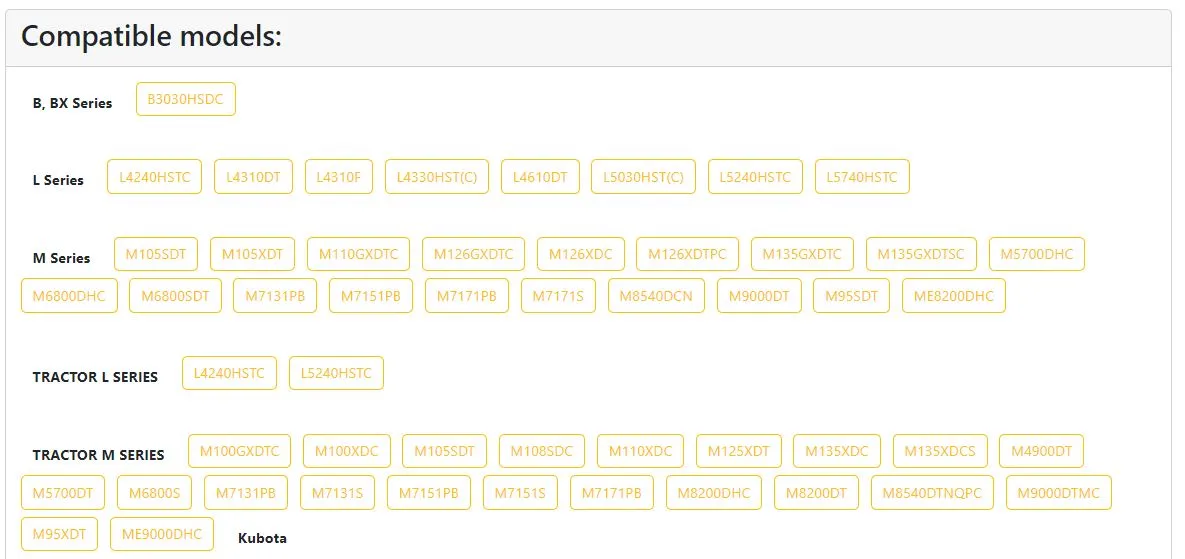 This plate is compatible with a wide range of Kubota models, including: