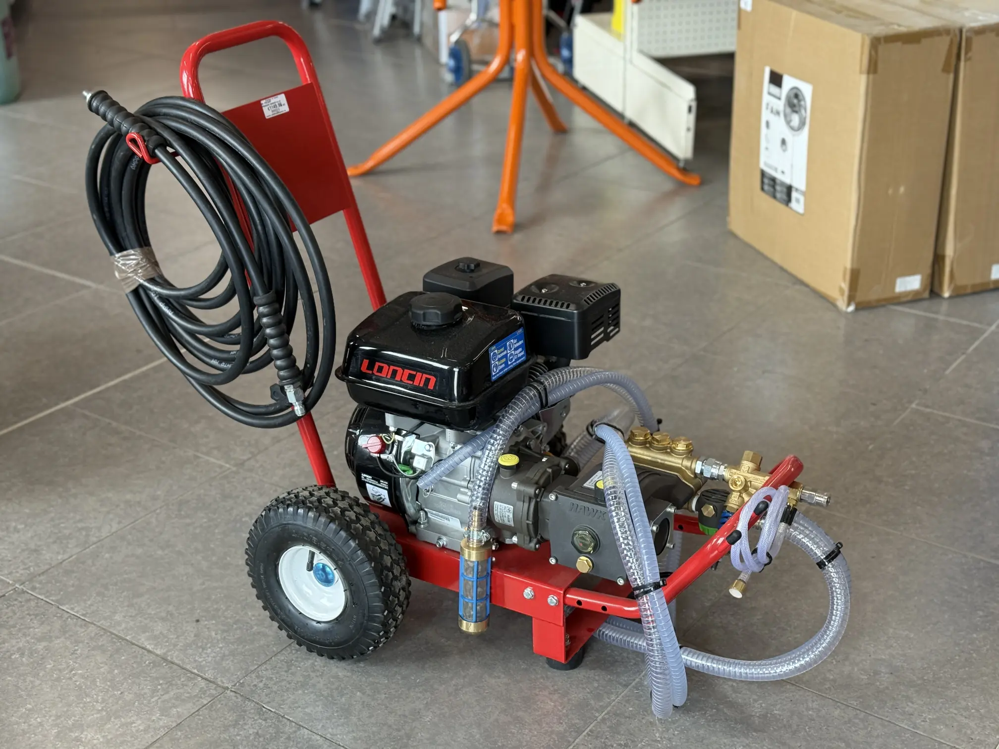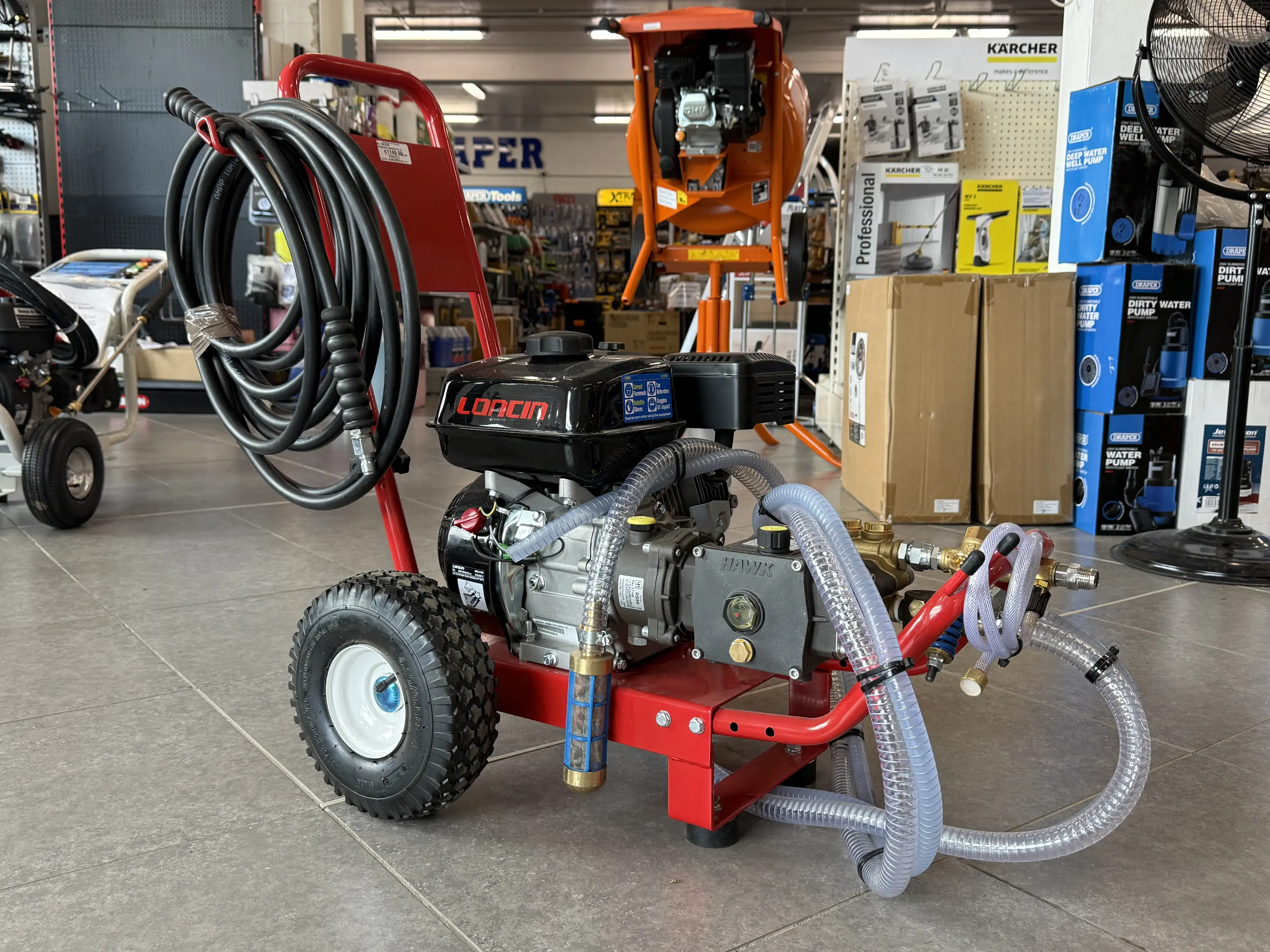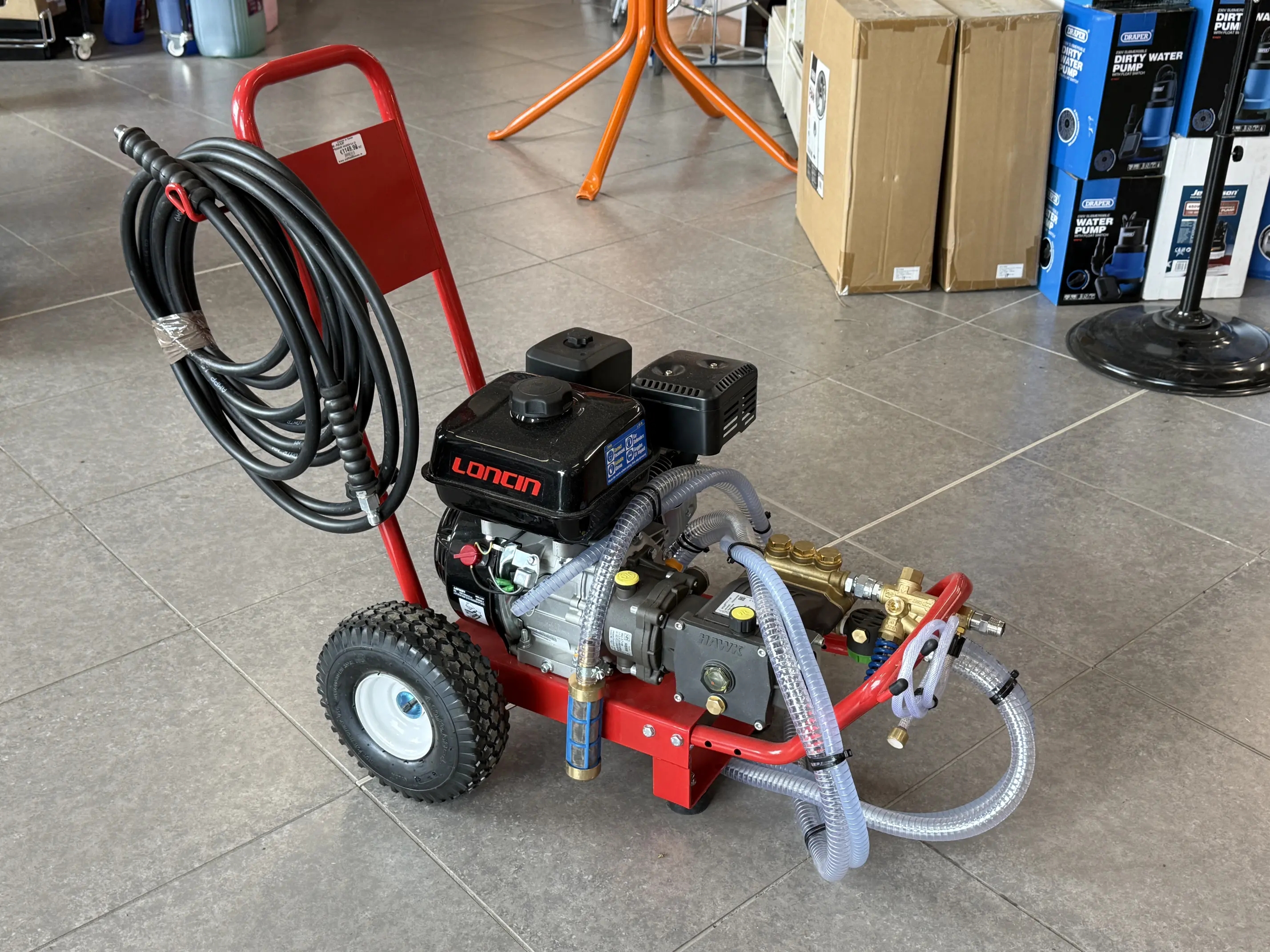 Loncin G200F 6.5HP Engine & Commercial Grade Hawk. The benefit of having a reduction gearbox between the engine and pump, slows the pump speed down to 1450 RPM extending the pump life. Recommended for all prolonged usages.