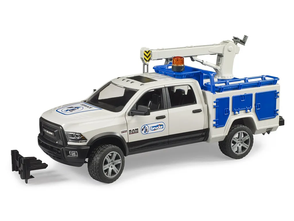 Bruder RAM 2500 Service Vehicle 02509 - The RAM brand is well recognized, not only in the leisure sector. This pick-up is also used as the basis for many commercial vehicles, as RAM developed this model as a heavy-duty pick-up truck. The latest acquisition in the field of commercial vehicles is the RAM service vehicle truck. It is used where repair and service work is carried out on large machines, e.g. in agriculture or on construction sites. It is for this purpose equipped with a rotating and extendable assembly crane. Necessary tools and spare parts can be stored in many drawers. Familiar elements such as steering wheel and suspension axle extension, and versatile vehicle protection light. For even more fun, this versatile vehicle is completed by two bworld mechanics (product no 62100) and the bworld construction set (product no 62007).