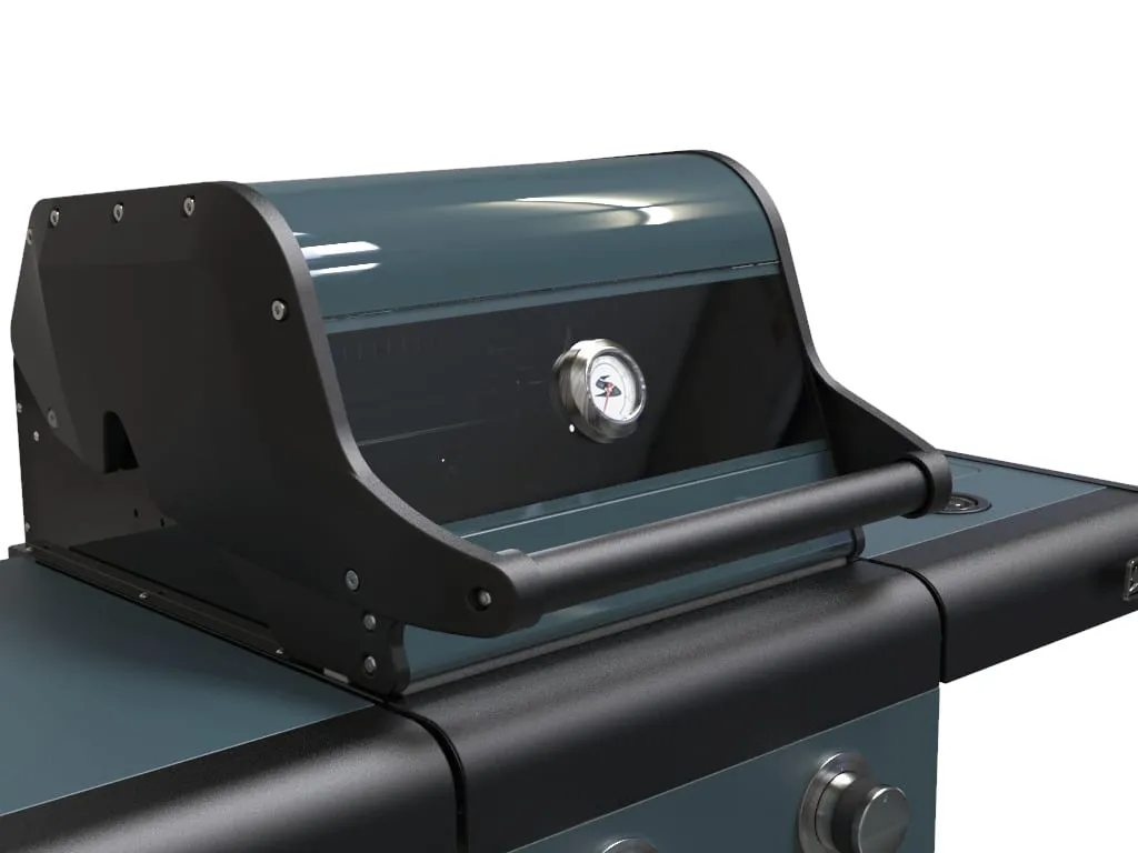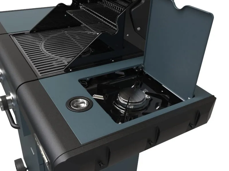 Burner Two high energy stainless steel burners Colour Smoky Teal Cooking Area 2200 cm² Gas Type Propane (Gas hose and regulator included). Ignition Electronic Ignition (main burners) and Piezo Ignition (side burner) kW Rating 10.9 Weight 59 kg Dimensions 1240(H) x 1260 (W - Shelf Down 1000 )x 700 (D) mm