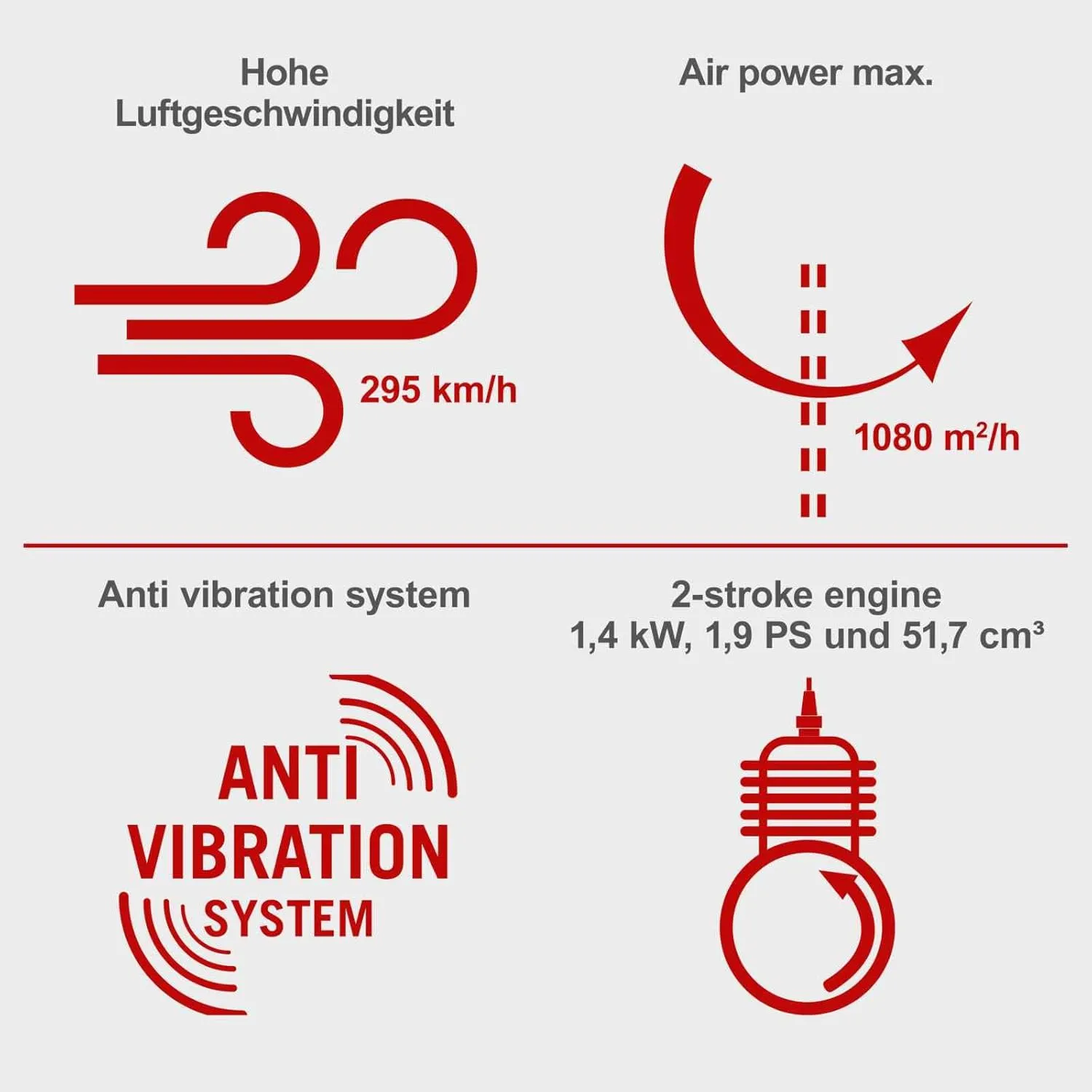 Fitted with a 51.7cc 2-stroke engine producing 1.9 horsepower and 1400W of power, this blower delivers an airspeed of up to 295 km/h and 18 m³/min airflow – more than enough for tough clearing jobs. The fully padded backpack harness and integrated anti-vibration system ensure operator comfort during extended use, while its high-capacity 1L fuel tank keeps downtime minimal.