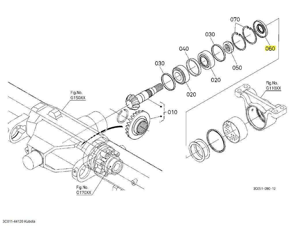 The Kubota 3C011-44120 oil seal is an OEM component specifically designed for use in the front bevel gear assembly. It maintains a tight seal to prevent lubricant leakage while keeping out dirt, water, and debris, ensuring smooth and reliable drivetrain operation.
