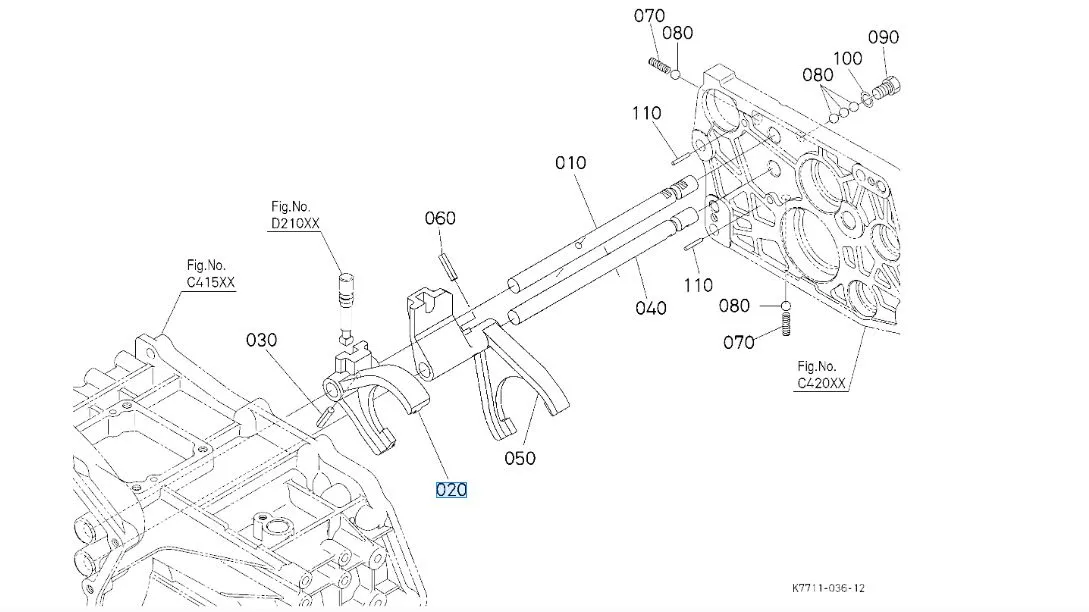 The K7561‑13020 shift fork (sub) is a precision-machined part that fits inside the transmission or shift rail assembly to engage a specific gear (often the sub or intermediate gear). It’s a “sub” or secondary fork (versus main shift fork) used in the range gear shift mechanism. As an OEM part, it ensures proper fit, alignment, and durability in the shifting assembly.