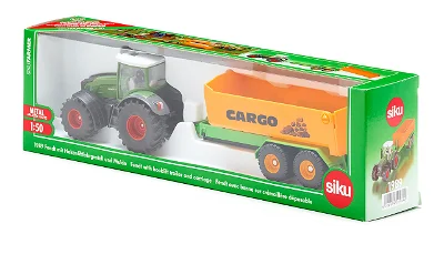 The Fendt with Hooklift Trailer and Carriage is a robust SIKU model in 1:50 scale, featuring a powerful Fendt tractor with a flexible front loader, hooklift chassis, and a detachable roof. It offers stability, durability, and a realistic play experience with detailed craftsmanship