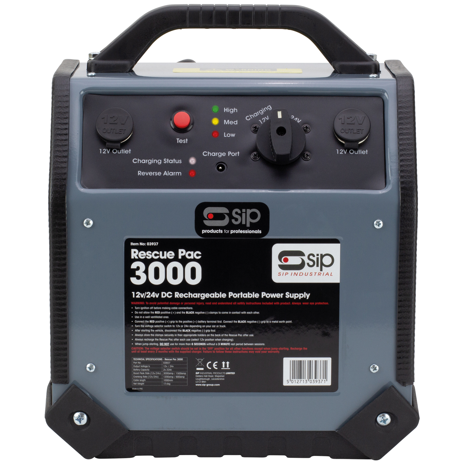 The SIP Rescue Pac 3000 utilises high-quality and proven AGM technology in order to start a range of small and large vehicles with precision, purpose-designed for powerful boosting and durability through heavy-duty leads and clamps, and robust steel casing. Moreover, the Rescue Pac 3000 is fitted with a reverse polarity alarm and indication and automatic circuit overload protection for increased safety and peace-of-mind. Perfect for boost-starting a range of ATVs, motorcycles, cars, vans, trucks, tractors, and excavators safely and efficiently, plus service, mobile, and roadside applications.
