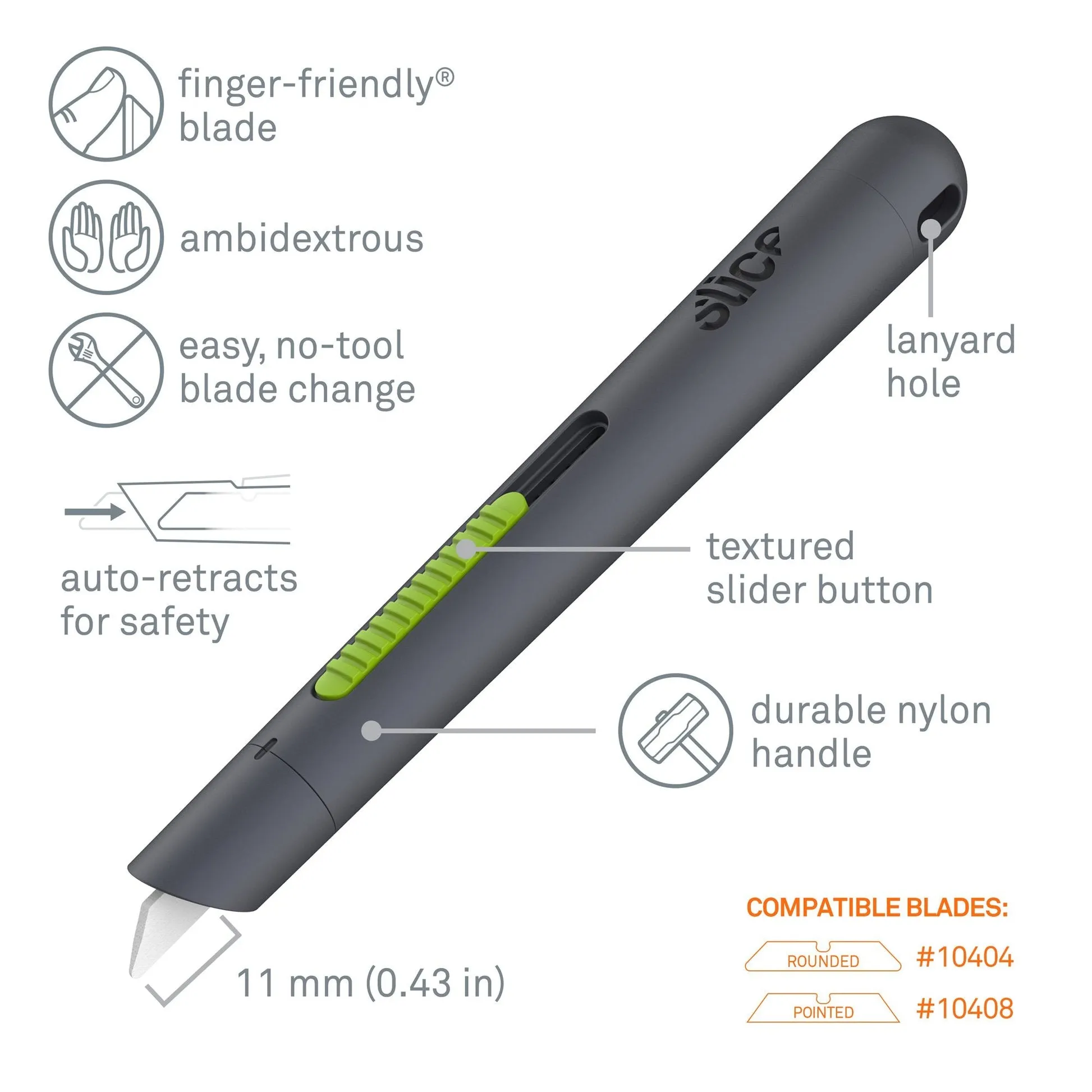 The Slice Auto-Retractable Pen Cutter allows you to work safely with a versatile tool that fits perfectly in your workforce’s fingers. The cutter’s blade is the safest you’ll find in the workplace. Its unique finger-friendly blade is safe to the touch and therefore causes fewer and less severe injuries than all other traditional blades. Your frontline workers are further protected because the textured auto-retractable slider ensures the blade can never be accidentally left out. The reinforced nylon handle is highly durable, making it a great tool for industrial use. While the familiar, sleek shape of a pen means it is comfortable to hold, has universal uses, and is easy to store.