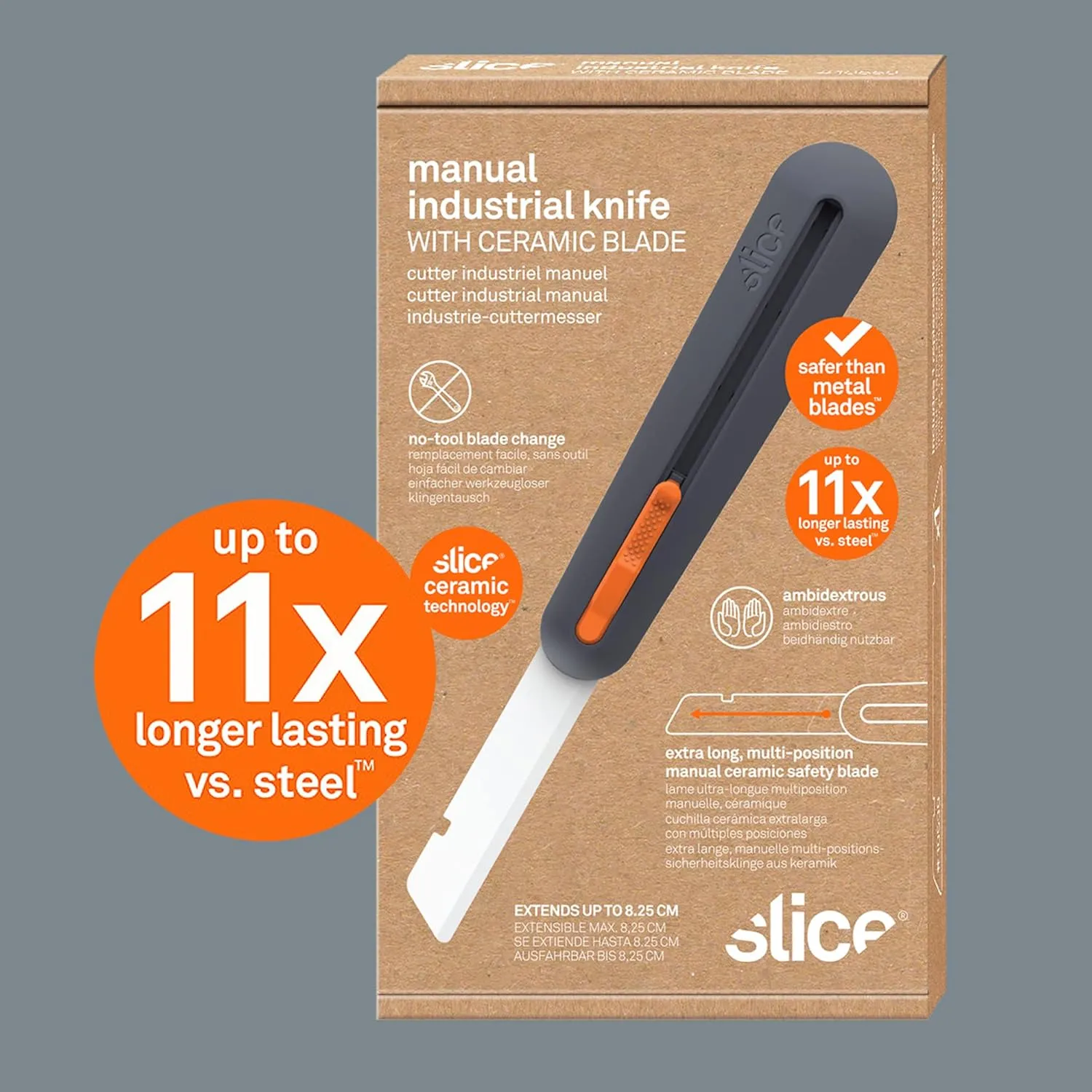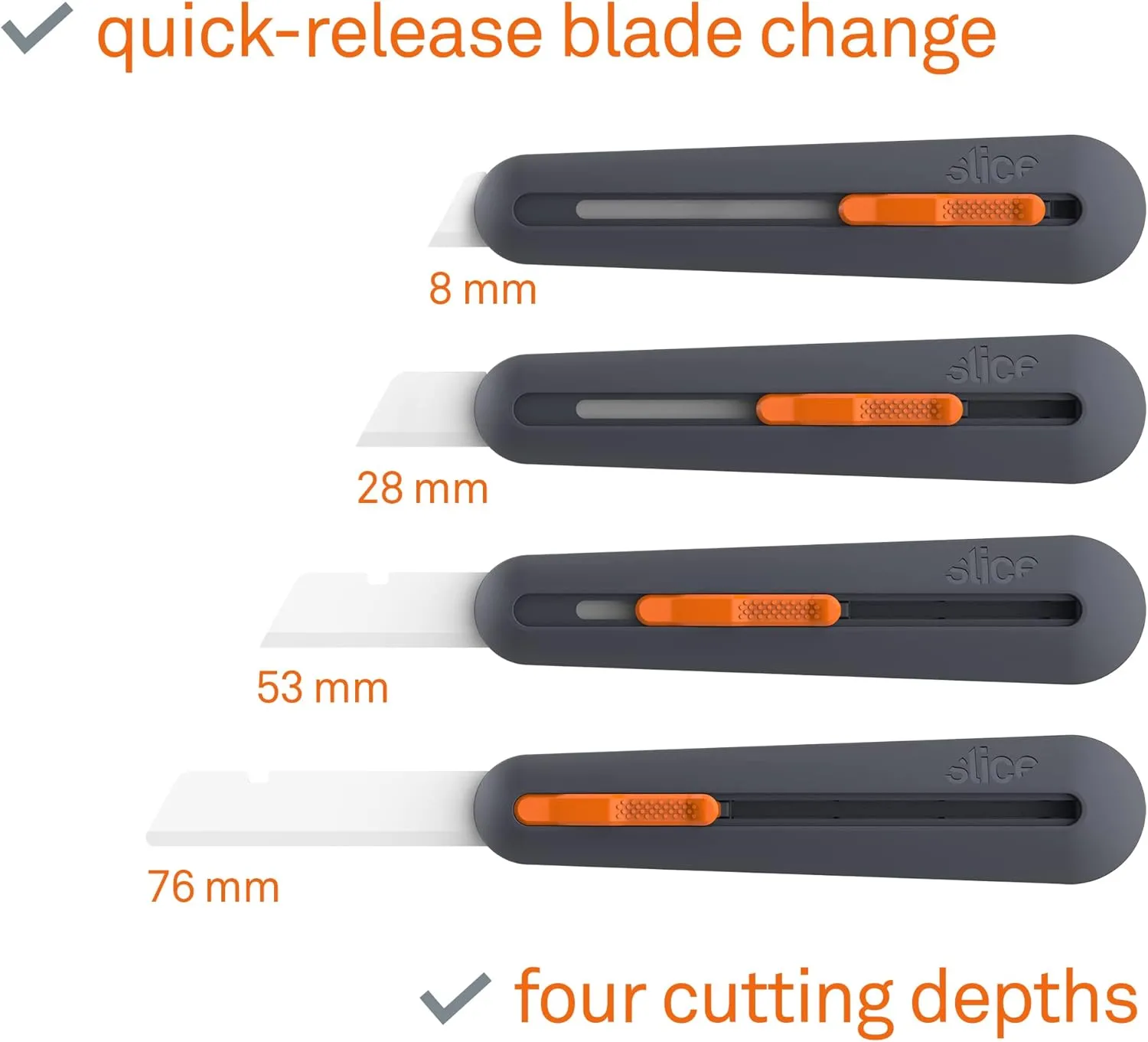 The 5-position manual slider gives users four distinct cutting depths plus a fully retractable option, making it versatile for different tasks. Like all Slice tools, the 10559 comes with a finger-friendly® ceramic safety blade, designed to cut materials effectively while reducing the risk of accidental injuries.
