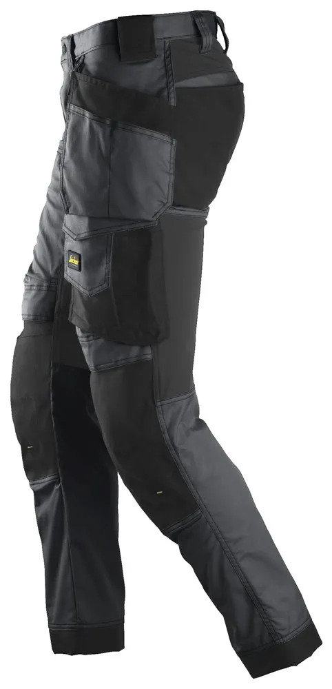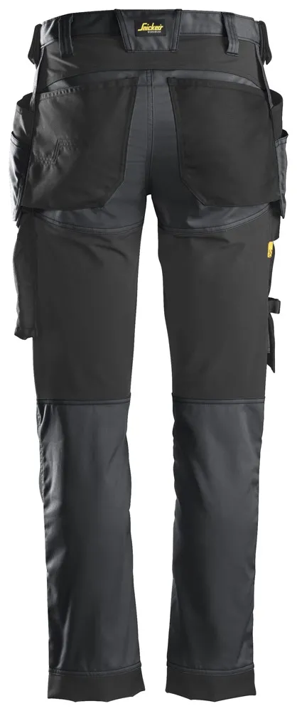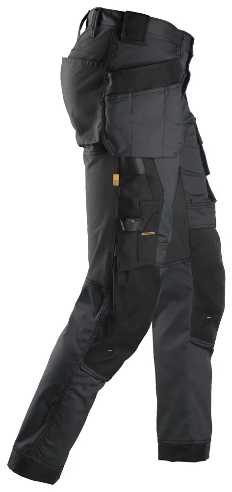 These Allround Work Stretch Trousers with holster pockets are made from full-stretch material for flexibility and comfort. The 2-way stretch fabric is supplemented by 4-way stretch panels in the rear for enhanced freedom of movement. Cordura®-reinforced Kneeguard™ pockets offer additional comfort and protection. Holster, ruler, and cargo pockets provide easy access to tools and also feature Cordura® reinforcement for durability. Cordura® material lines in other areas that are subject to stress for mobility and performance in light to regular environments.