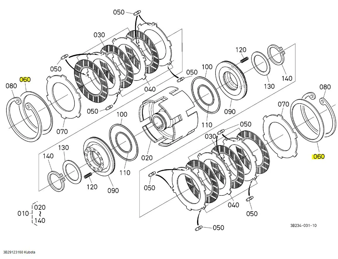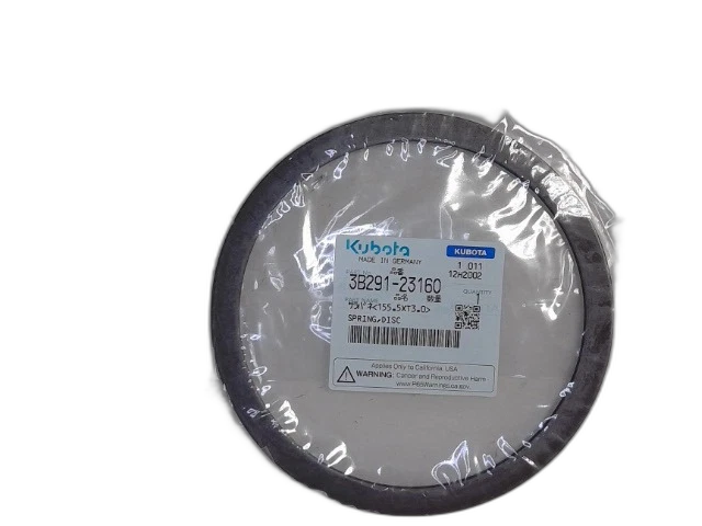 The Kubota 3B291-23160 spring disc is an OEM replacement component designed for use in Hi-Lo and Shuttle clutch packs. Its role is to maintain correct clutch plate spacing and tension, ensuring smooth operation and reliable engagement under load.