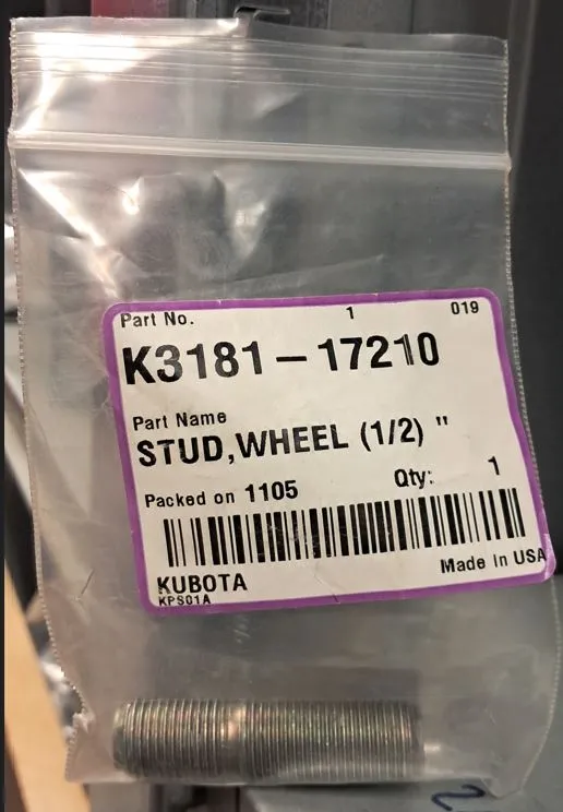 The Kubota K3181-17210 Wheel Stud (1/2") is a high-quality replacement part engineered for optimal rear wheel attachment. Designed to fit specific Kubota models, this OEM stud ensures safe and secure wheel installation, enhancing operational efficiency and safety.