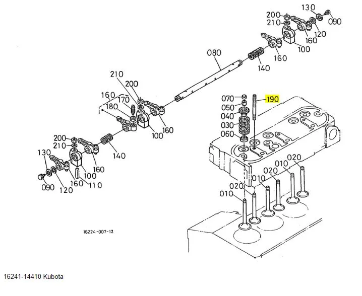 The Kubota stud 16241-14410 is an essential part of the rocker arm assembly, providing structural support and secure positioning for valve components. As a genuine OEM fastener, it is manufactured to meet exact specifications for strength and durability, ensuring a precise fit and long-term reliability in your engine.