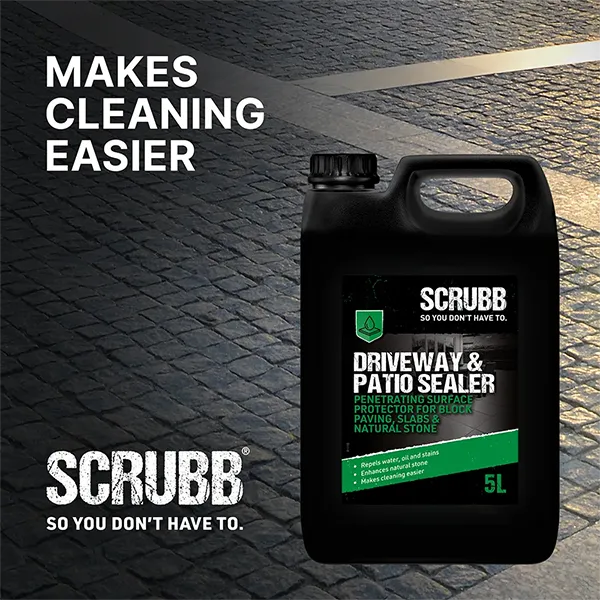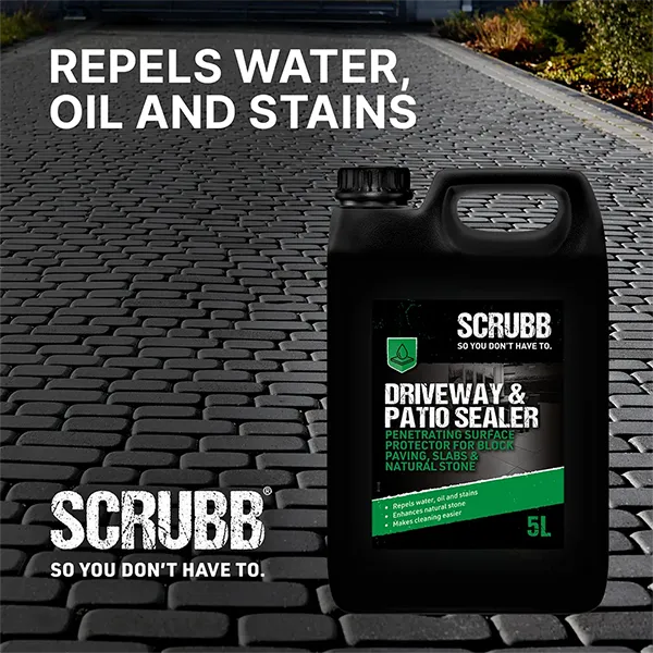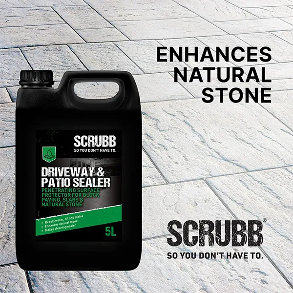 SCRUBB Patio & Driveway Sealer creates a tough, invisible seal on all porous natural and artificial stone such as sandstone, marble, concrete, slate, terracotta and brick. Applied to new or thoroughly cleaned surfaces it will resist stains, make cleaning easier and keep paved areas looking new for longer. It will produce a mild colour-enhancing effect, the intensity of which will vary depending on the type of material it is applied to.