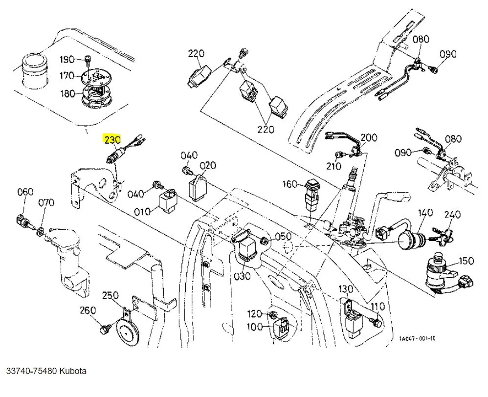 The Kubota 33740-75480 Stop Switch is a genuine OEM replacement component designed to provide reliable engine shutoff functionality in numerous Kubota tractor models. This switch plays a critical role in stopping the engine safely via electrical control circuits and is commonly found in panel boards, relay assemblies, and rear sensor systems.