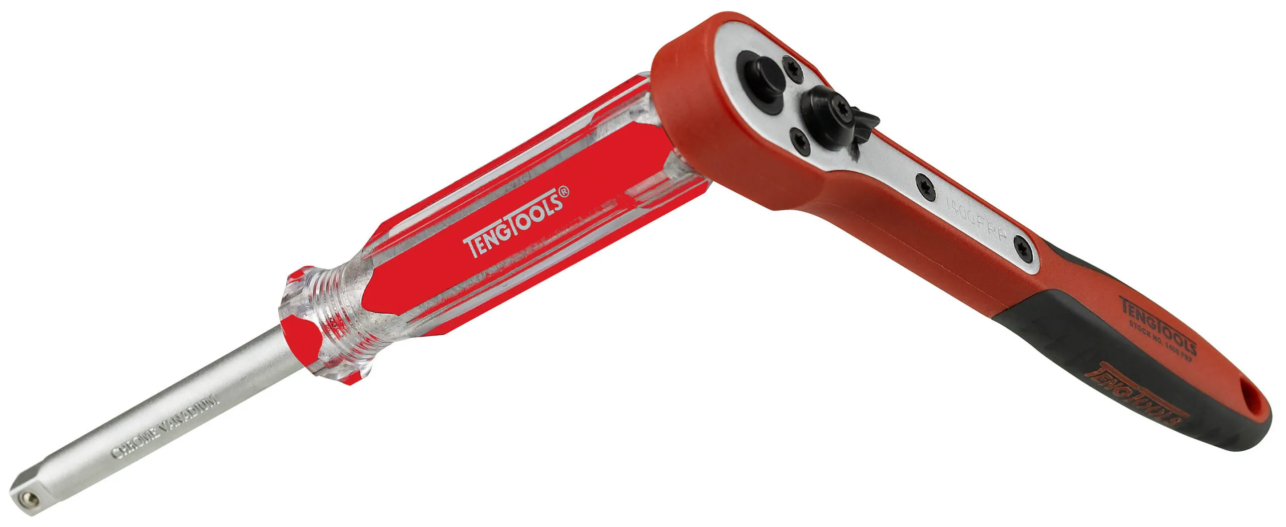 1/2" drive steel reinforced fibre ratchet handle. Features include 45 teeth (8 degree increment), quick release and flip reverse functions. The ratchet meets or exceeds all internationally recognised quality and torque specifications. The design protected ratchet (24583ROC) is not only lighter and just as strong but it is more comfortable to use than regular ratchets. It also features a new style bi-material handle for a more comfortable grip. DIN 3122D.