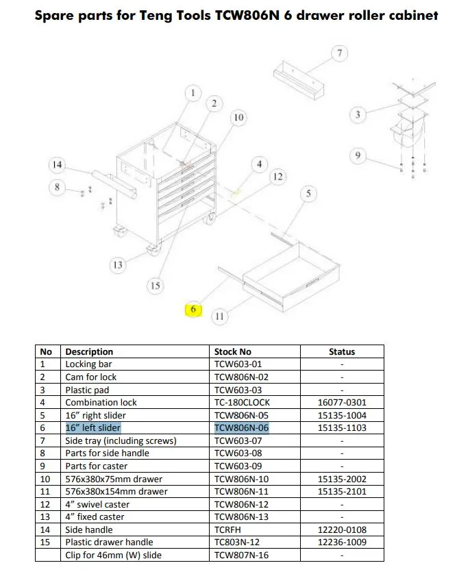 According to the official Teng Tools spare parts listings, the 16" left slider for the TCW806N is identified by part number TCW806N‑06 and part code 15135‑1103.