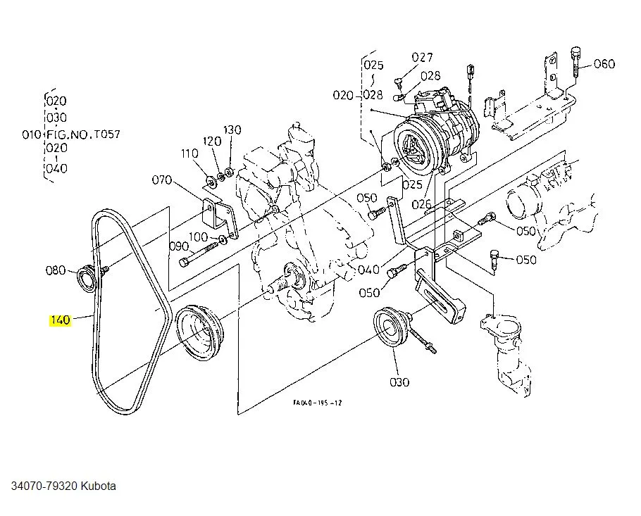 The Kubota 34070-79320 V-Belt is a genuine OEM part designed for use with air conditioning compressors in a wide range of Kubota cab-type tractors. This high-quality V-belt provides the necessary drive between the engine and the compressor, ensuring efficient performance of the tractor’s A/C system.