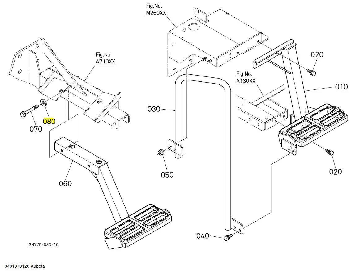 Auxiliary Steps: Provides secure fastening and support for auxiliary steps, ensuring stability and safety in Kubota equipment.