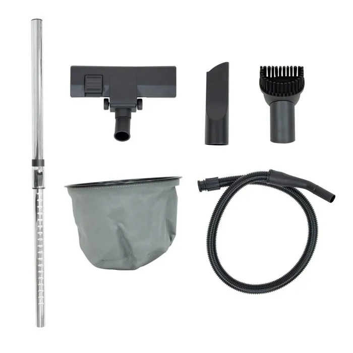 Complete Accessory Set: Includes a floor brush with retractable bristles, round brush, crevice nozzle, telescopic metal pipe, 1.5m hose, and cloth filter for various cleaning applications.